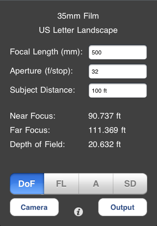 Earlier this year I moved up from point-and-shoot digital cameras to my first DSLR and have been experimenting a lot with the extra control this affords. One of my favorite playgrounds so far is the realm of selective focus; using the depth of field to call attention to the main subject. I found myself wishing for a tool that would help me pick the right settings for what I wanted to achieve. Thus, Field Marshal. In its simplest mode it will tell you what kind of depth of field you’re going to get for a combination of focal length, aperture and distance. It also will calculate the necessary value for any of those three factors, given the other two and a desired depth.